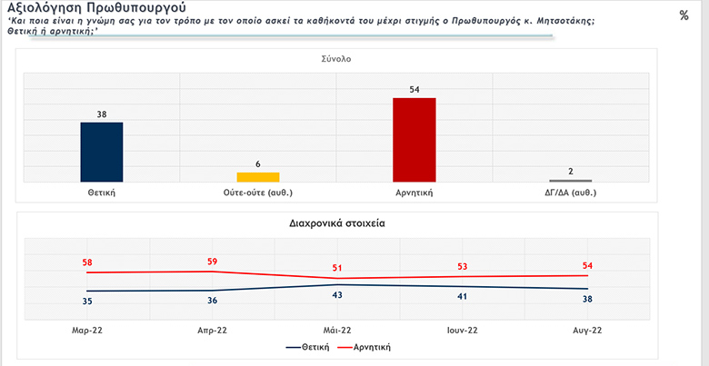 Το 54% απάντησε πως αξιολογεί αρνητικά τον πρωθυπουργό για τον τρόπο με τον οποίο ασκεί τα καθήκοντα του ενώ το 38% θετικά.