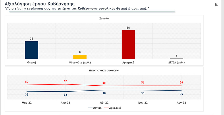 Στην ερώτηση: «Ποια είναι η εντύπωση σας για το έργο της Κυβέρνησης συνολικά; Θετική ή αρνητική;» το 35% απάντησε θετική και το 56% αρνητική.