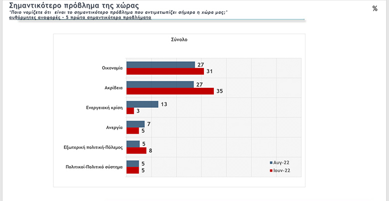 Στην ερώτηση: «Ποιο νομίζετε ότι είναι το σημαντικότερο πρόβλημα που αντιμετωπίζει σήμερα η χώρα μας;» οι απαντήσεις των περισσοτέρων αφορούσαν οικονομικά ζητήματα.