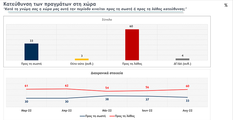 «Κατά τη γνώμη σας η χώρα μας αυτή την περίοδο κινείται προς τη σωστή ή προς τη λάθος κατεύθυνση;» ήταν η πρώτη ερώτηση και το 33% των ερωτηθέντων απάντησε προς την σωστή ενώ το 60% προς τη λάθος.