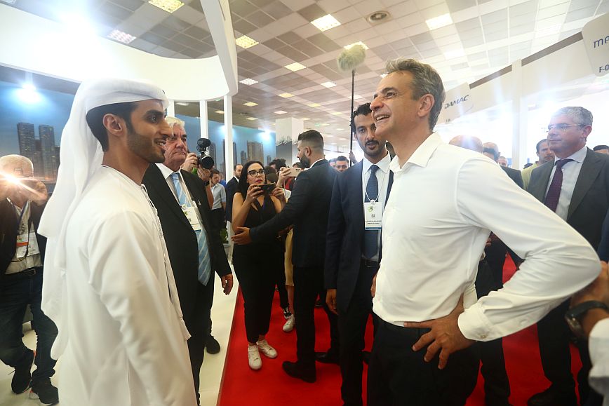 Κατά τη διάρκεια της περιήγησής του στα περίπετρα της Έκθεσης, ο πρωθυπουργός συνομίλησε με άτομα από την αντιπροσωπεία των ΗΑΕ.