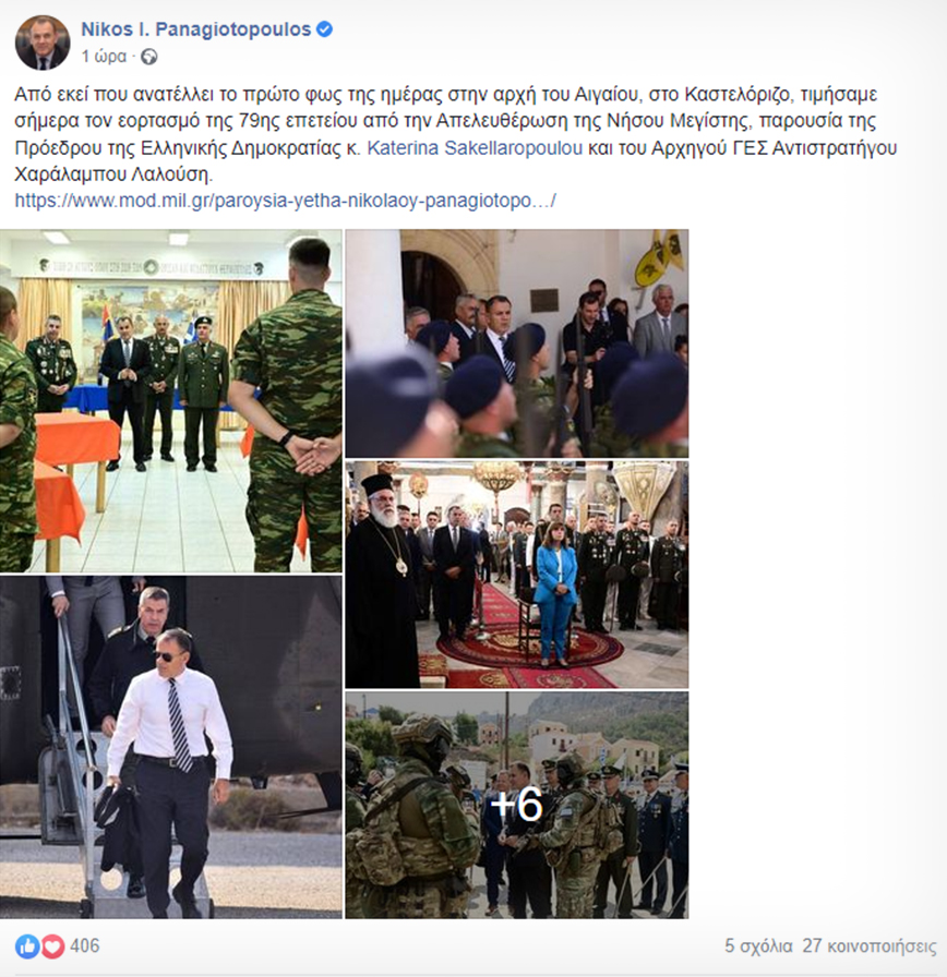 Ο υπουργός Άμυνας που βρέθηκε σε εκδηλώσεις που πραγματοποιήθηκαν στο νησί μαζί με την Πρόεδρο της Δημοκρατίας, σε ανάρτηση που έκανε στο Facebook, σημείωσε το εξής:
