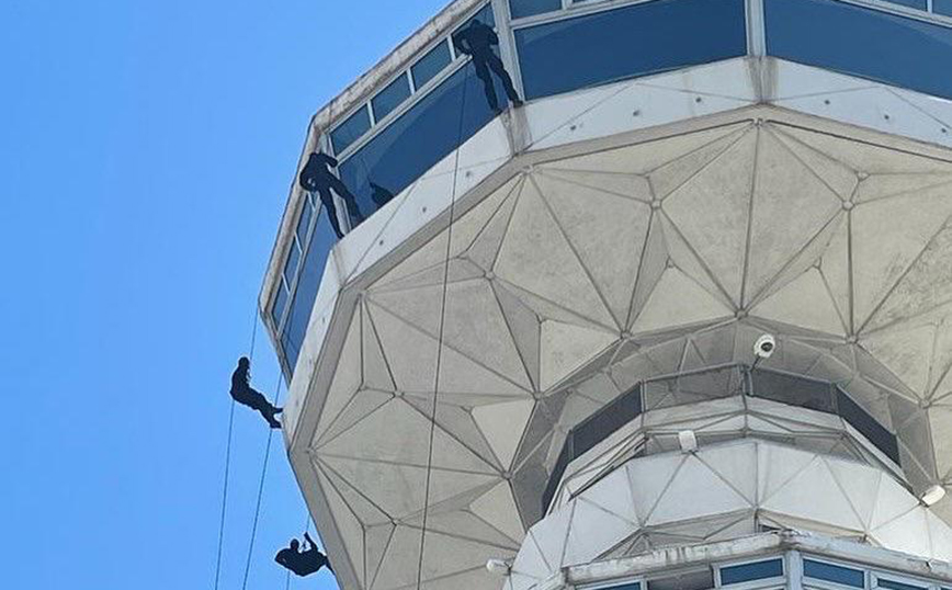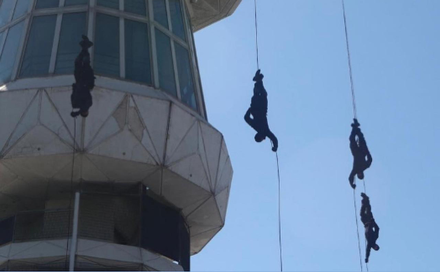 Μία ομάδα τεσσάρων ανδρών της ΕΚΑΜ, φέροντας τον κατάλληλο εξοπλισμό και σε άρτιο συντονισμό, καταρριχήθηκαν από τον πύργο του ΟΤΕ με ειδικά σχοινιά από ύψος 40 μέτρων.