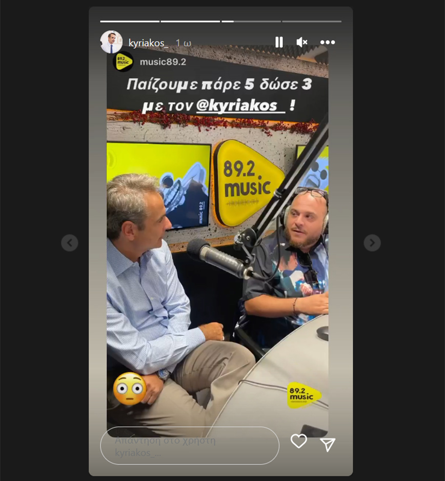 Ο Κυριάκος Μητσοτάκης, αφού έστειλε μήνυμα στην Τουρκία κατά τη συνέντευξή του στον ραδιοφωνικό σταθμό Sfera 102,2, βρέθηκε στην εκπομπή του Φάνη Λαμπρόπουλου στον Music 89,2. Ο πρωθυπουργός φαίνεται πως δεν είχε άλλη επιλογή παρά να παίξει με τον Φάνη Λαμπρόπουλο και την Ελένη Βουλγαράκη «Πάρε 5 δώσε 3».