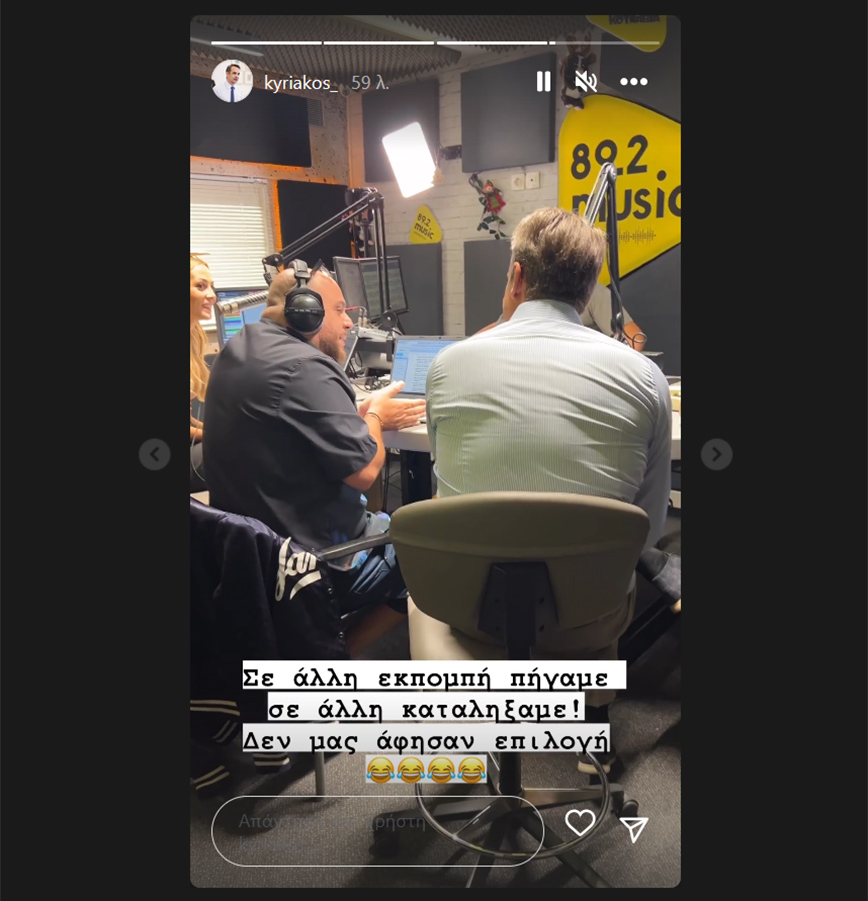 «Σε άλλη εκπομπή πήγαμε, σε άλλη καταλήξαμε. Δεν μας άφησαν επιλογή» γράφει με χιούμορ ο Κυριάκος Μητσοτάκης στο βίντεο που δημοσίευσε στον προσωπικό του λογαριασμό στο Instagram.