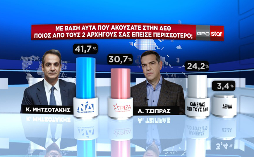Σημειώνεται, πως στην ίδια έρευνα, πριν από τη ΔΕΘ η διαφορά ήταν στις 7,5 μονάδες, ενώ μετά τις εξαγγελίες του πρωθυπουργού το ποσοστό ανέβηκε στο 8,5%.