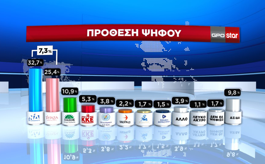 Στη δημοσκόπηση του STAR η διαφορά ΝΔ με ΣΥΡΙΖΑ βρίσκεται στις 7,3 μονάδες: ΝΔ 32,7%, ΣΥΡΙΖΑ 25,4%, ΠΑΣΟΚ 10,9%, ΚΚΕ 5,3%, Ελληνική Λύση 3,8%, ΜέΡΑ 25 2,2%, Έλληνες για την Πατρίδα 1,7%, Εθνική Δημιουργία 1,5%, άλλο κόμμα 3,9%, άκυρο – δεν θα ψηφίσω 2,9%, αδιευκρίνιστη ψήφος 9,8%.