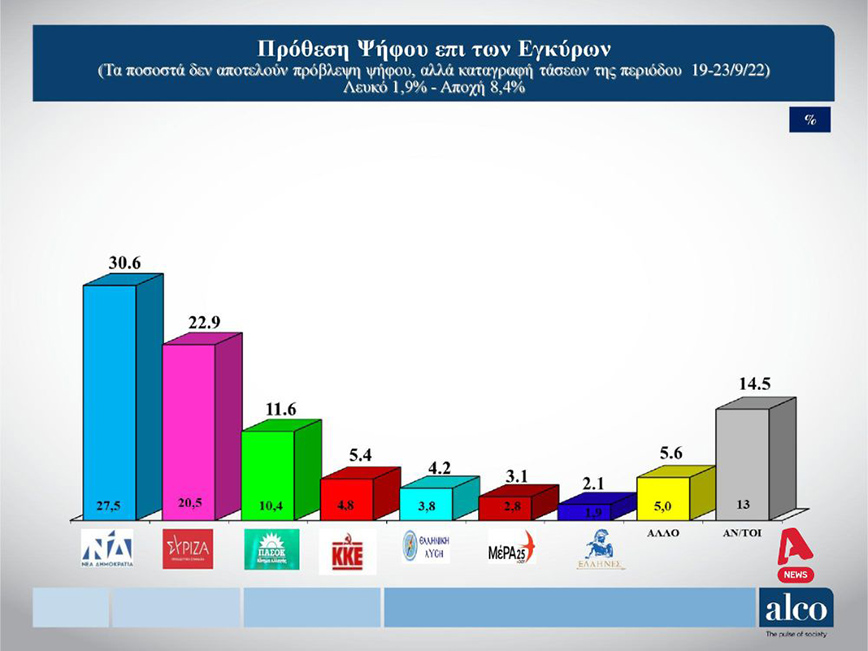Η διαφορά της Νέας Δημοκρατίας από τον ΣΥΡΙΖΑ βρίσκεται στις 7,7 μονάδες, σύμφωνα με τη δημοσκόπηση της Alco για το κεντρικό δελτίο ειδήσεων του Alpha.