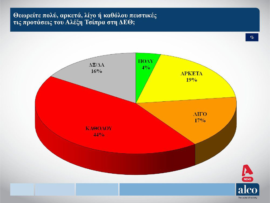 Για το πόσο έπεισαν τα όσα είπε ο Αλέξης Τσίπρας στη ΔΕΘ: 44% καθόλου, 23% αρκετά, 17% λίγο, 4% πολύ.