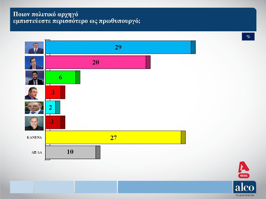 Στο ερώτημα ποιον εμπιστεύεστε περισσότερο για πρωθυπουργό: 29% τον Κυριάκο Μητσοτάκη, 20% τον Αλέξη Τσίπρα, 27% κανέναν, 6% τον Νίκος Ανδρουλάκη, 3% τον Δημήτρη Κουτσούμπα, 2% τον Κυριάκο Βελόπουλο, 3% τον Γιάννη Βαρουφάκη, 10% ΔΞ/ΔΑ.