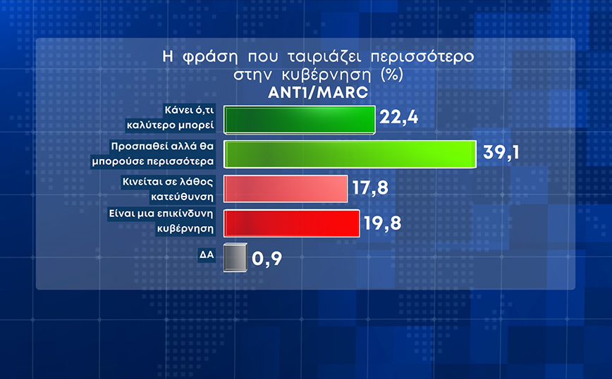 Το 61,5% των ερωτηθέντων χαρακτηρίζει πως η κυβέρνηση κάνει ό,τι καλύτερο μπορεί, προσπαθεί, αλλά θα μπορούσε και λίγο καλύτερα.