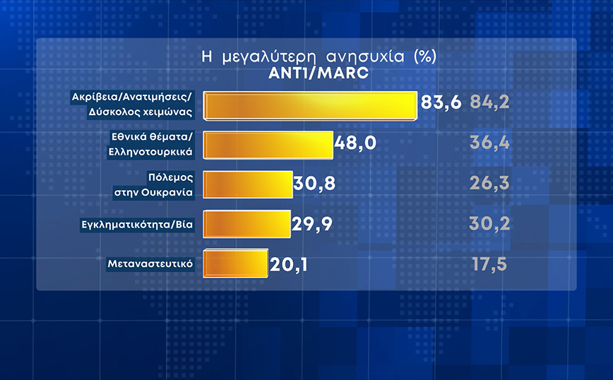 Όπως φαίνεται από τη δημοσκόπηση, η μεγαλύτερη ανησυχία των ερωτηθέντων είναι η ακρίβεια, οι ανατιμήσεις και ο δύσκολος χειμώνας που έρχεται με ποσοστό 83,6%.