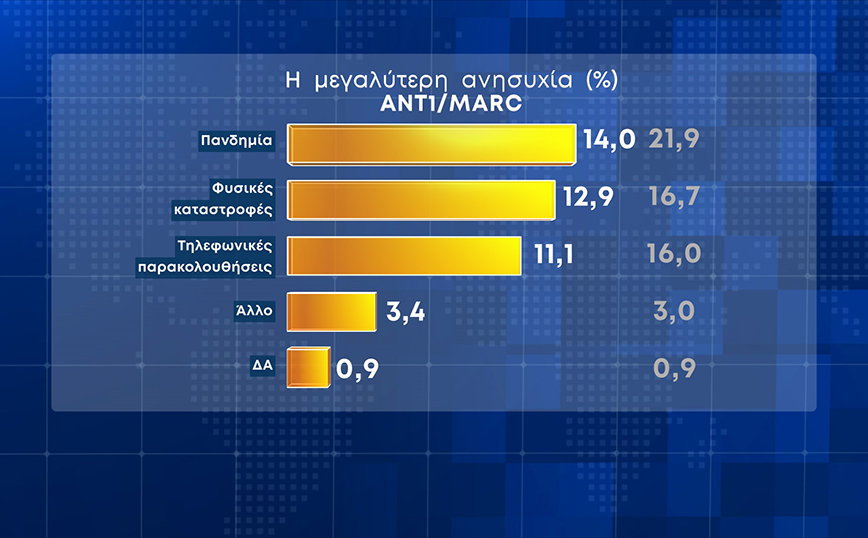 Ο κορονοϊός, οι παρακολουθήσεις και οι φυσικές καταστροφές, φαίνεται να απασχολούν μικρότερη μερίδα κόσμου με 14%, 11,1% και 12,9% αντίστοιχα.