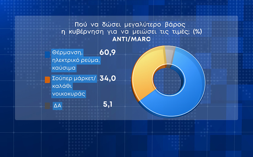 Για το πού θα πρέπει να δώσει το μεγαλύτερο βάρος η κυβέρνηση για τη μείωση των τιμών, το 60,9% απάντησε στη θέρμανση, το ηλεκτρικό ρεύμα και τα καύσιμα, το 34% στο σούπερ μάρκετ και 5,1% είπε ΔΑ.