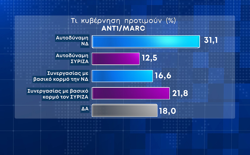 Σχετικά με το τι κυβέρνηση προτιμούν απάντησαν το 31,1% ότι θέλουν αυτοδύναμη κυβέρνηση της Νέας Δημοκρατίας, το 12,5% αυτοδυναμία ΣΥΡΙΖΑ ενώ το κυβέρνηση συνεργασίας με βασικό κορμό τη Νέα Δημοκρατία προτιμά το 21,8% και με βασικό κορμό τον ΣΥΡΙΖΑ, το 21,8%.