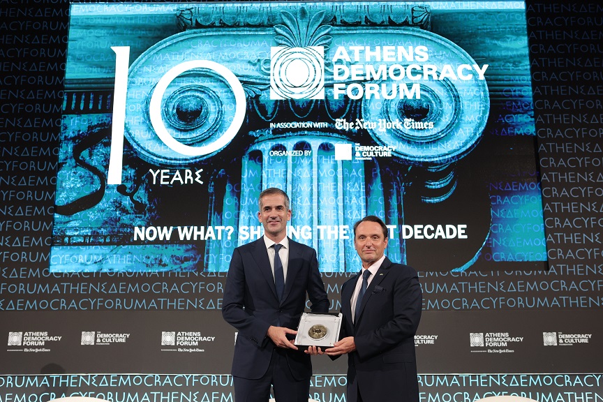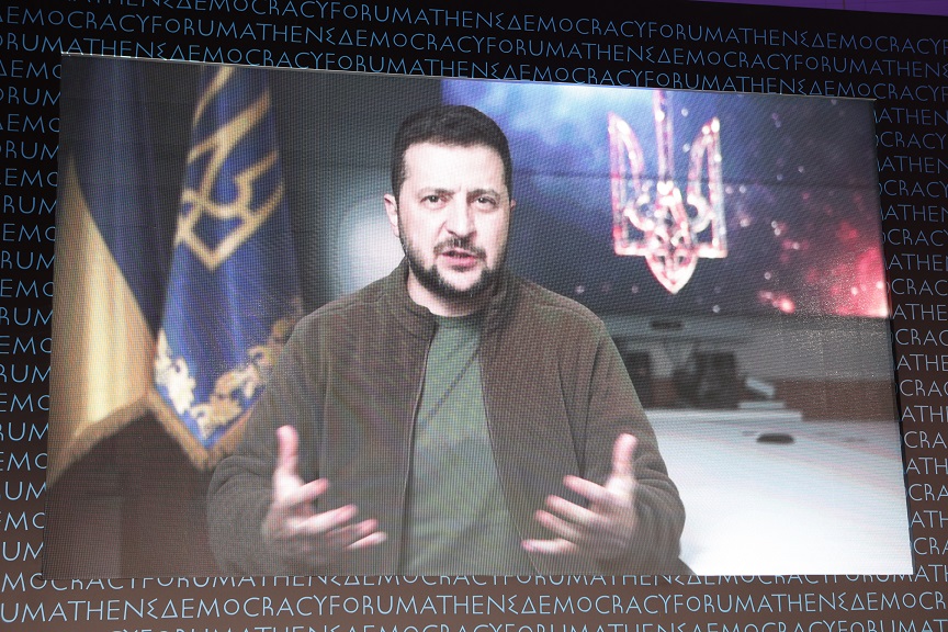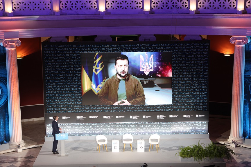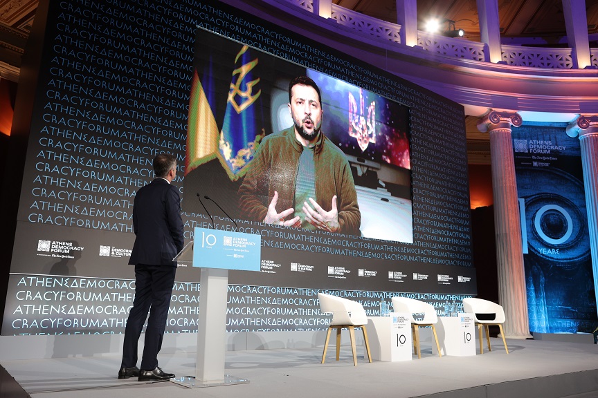 Το βραβείο Δημοκρατίας της πόλης των Αθηνών, της πόλης που «γέννησε» τη Δημοκρατία και ανέδειξε τις αξίες της, απένειμε στον Ουκρανό πρόεδρο Βολοντίμιρ Ζελένσκι, και μέσω αυτού στον λαό της Ουκρανίας, ο δήμαρχος Αθηναίων, Κώστας Μπακογιάννης, στο πλαίσιο του Athens Democracy Forum.