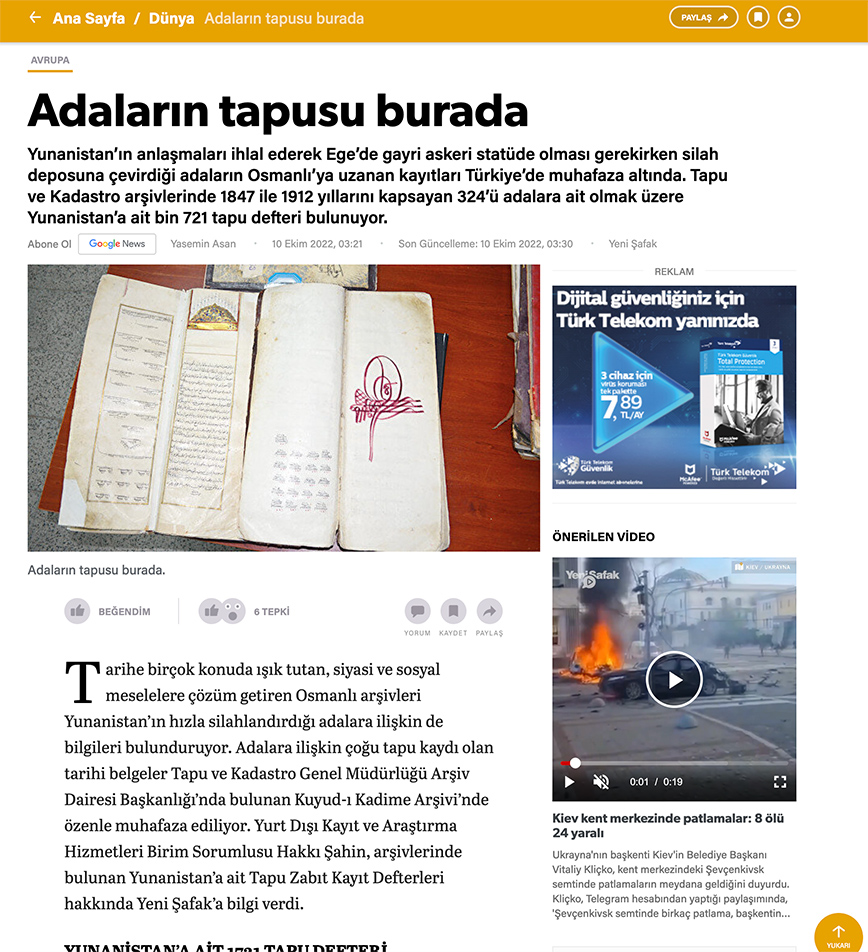«Τα αρχεία που χρονολογούνται από την Οθωμανική Αυτοκρατορία για τα νησιά που η Ελλάδα μετέτρεψε σε αποθήκες όπλων – κατά παράβαση των συμφωνιών ενώ θα έπρεπε να τελούν σε αποστρατικοποιημένο καθεστώς – σώζονται στην Τουρκία. Στα αρχεία του Κτηματολογίου υπάρχουν 721 κτηματολογικά βιβλία που ανήκουν στην Ελλάδα, εκ των οποίων τα 324 ανήκουν στα νησιά και καλύπτουν τα έτη μεταξύ 1847 και 1912» αναφέρει το δημοσίευμα που φιλοξενεί δηλώσεις του επικεφαλής του Τμήματος Έρευνας του αρχείου Χακί Σαχίν.