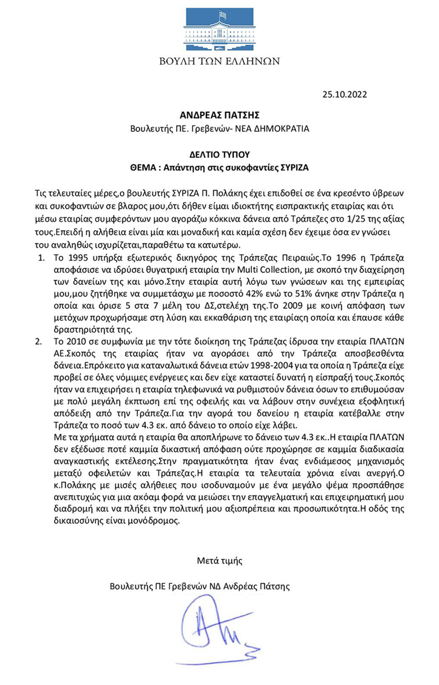 Ο κ. Πάτσης είχε κληθεί για εξηγήσεις από τον γραμματέα τη ΚΟ της ΝΔ μετά την καταγγελία από τον ΣΥΡΙΖΑ ότι είναι ιδιοκτήτης ξένων εταιρειών ειδικού σκοπού που αγόρασαν «κόκκινα» δάνεια ύψους 62 εκατ. ευρώ με μόλις 4,3 εκ. ευρώ.