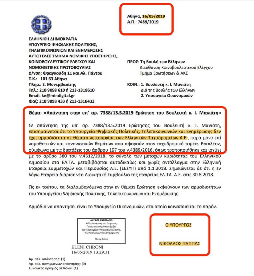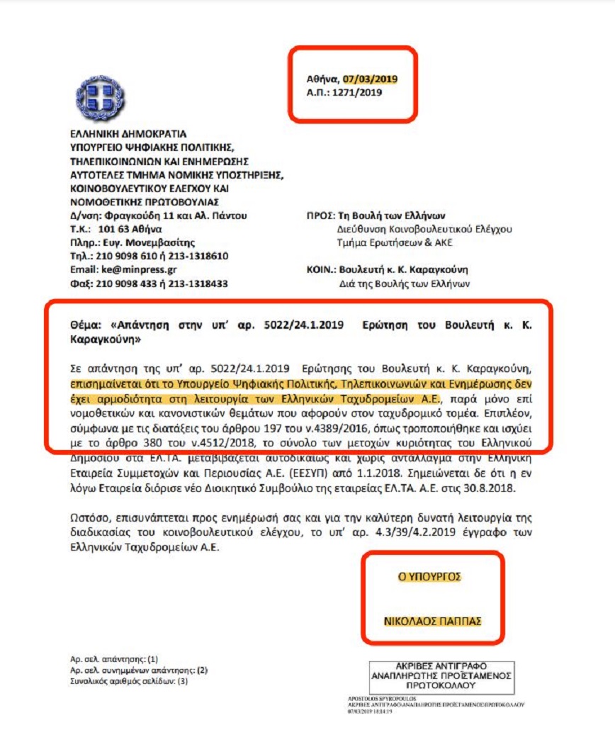 Παράλληλα, σημείωσαν πως «ο ΣΥΡΙΖΑ το 2019 διακήρυττε με επίσημες δηλώσεις ότι τα ΕΛΤΑ δεν βρίσκονται στην εποπτεία του Υπουργείου Ψηφιακής Πολιτικής, αλλά ότι το τελευταίο έχει αρμοδιότητα μόνο επί των νομοθετικών και κανονιστικών θεμάτων που αφορούν στον ταχυδρομικό τομέα. Αυτό δεν τους εμποδίζει, σήμερα, να “χρεώνουν” στο Υπουργείο Ψηφιακής Διακυβέρνησης αποφάσεις του Δ.Σ. των ΕΛΤΑ που αφορούν στην καθημερινή λειτουργία του οργανισμού, παραβιάζοντας κάθε θεσμική λογική και λειτουργία. Πέρα από το γεγονός ότι μια τέτοια κατηγορία δεν ευσταθεί νομικά, μήπως εν τέλει αντανακλά πρακτικές που ίσχυαν επί των ημερών ΣΥΡΙΖΑ σε σχέση με οργανισμούς όπως τα ΕΛΤΑ;».