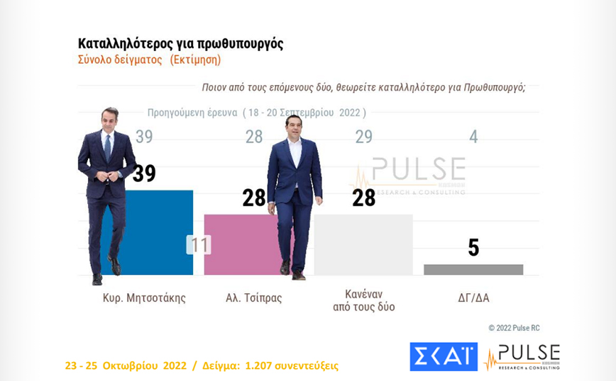 Καταλληλότερος για πρωθυπουργός εμφανίζεται ο Κυριάκος Μητσοτάκης με 39%, ακολουθεί ο Αλέξης Τσίπρας με 28%, ενώ 28% έχει και ο «κανένας». ΔΓ/ΔΑ από το 5%.