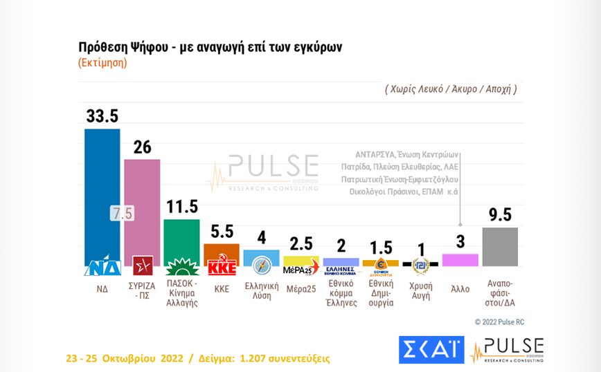 Στη δημοσκόπηση της Pulse για τον ΣΚΑΪ η διαφορά της Νέας Δημοκρατίας από τον ΣΥΡΙΖΑ βρίσκεται στις 7,5 μονάδες. Υπενθυμίζεται ότι στη χθεσινή δημοσκόπηση του ΑΝΤ1 η διαφορά των δύο πρώτων κομμάτων βρίσκεται στις 8,5 μονάδες.
