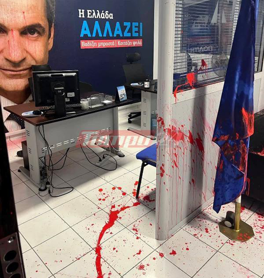 Τέσσερα άτομα με καλυμμένα τα πρόσωπά τους, πέταξαν μπογιές και φώναξαν συνθήματα στα γραφεία της Νέας Δημοκρατίας στην Πάτρα.
