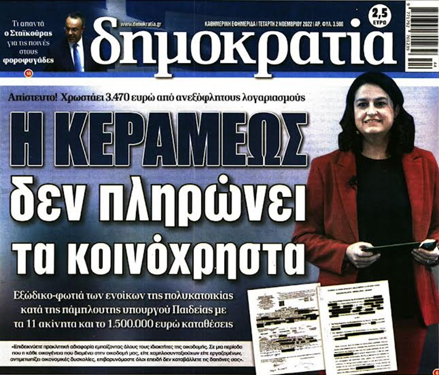 Την δικαστική οδό επιλέγει η υπουργός Παιδείας και Θρησκευμάτων Νίκη Κεραμέως ως απάντηση σε σημερινό πρωτοσέλιδο της εφημερίδας «Δημοκρατία», σύμφωνα με το οποίο χρωστά το ποσό των 3.470,86 ευρώ για κοινόχρηστα που δεν έχουν πληρωθεί εδώ και χρόνια, στη Θεσσαλονίκη. Αρχικά θα στείλει εξώδικο στο έντυπο και εάν δεν υπάρξει επανόρθωση με νέο πρωτοσέλιδο, τότε θα κατατεθεί αγωγή.