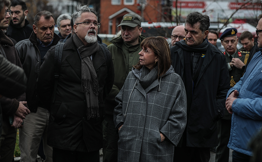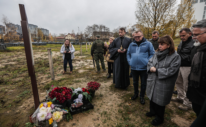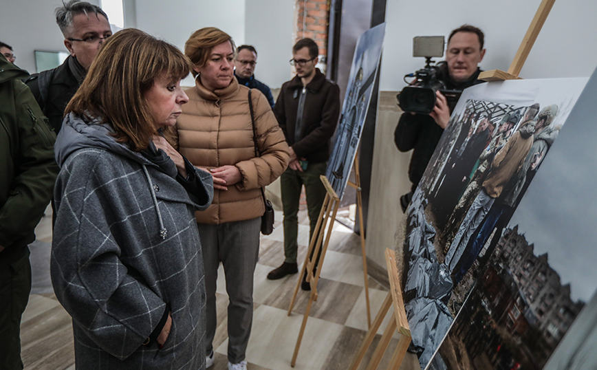 Στην Μπούτσα, όπως αναφέρει το ΑΠΕ-ΜΠΕ, η κυρία Σακελλαροπούλου περιηγήθηκε στο σημείο που βρέθηκαν ομαδικοί τάφοι Ουκρανών πολιτών στον περίβολο της εκκλησίας του Αγίου Ανδρέα και είδε φωτογραφική έκθεση με αμάχους θύματα του πολέμου.