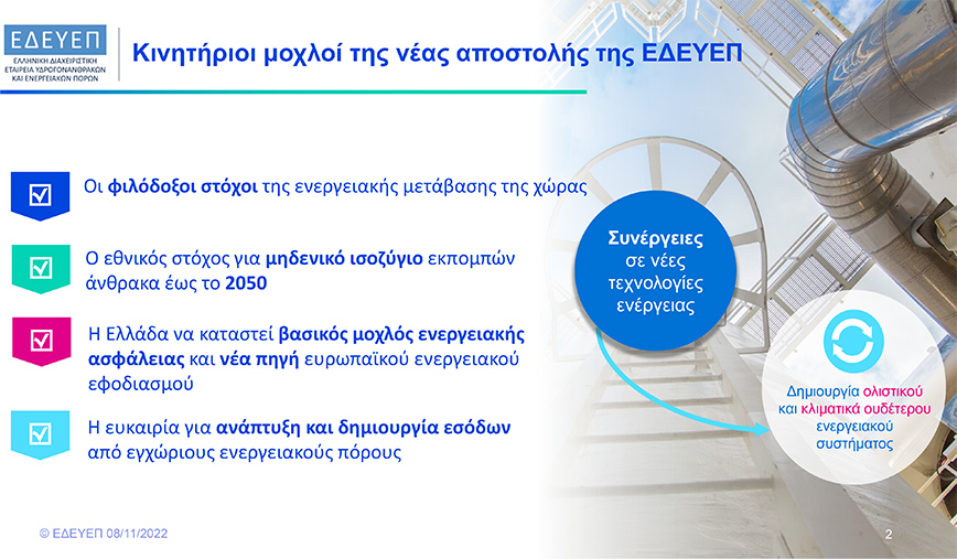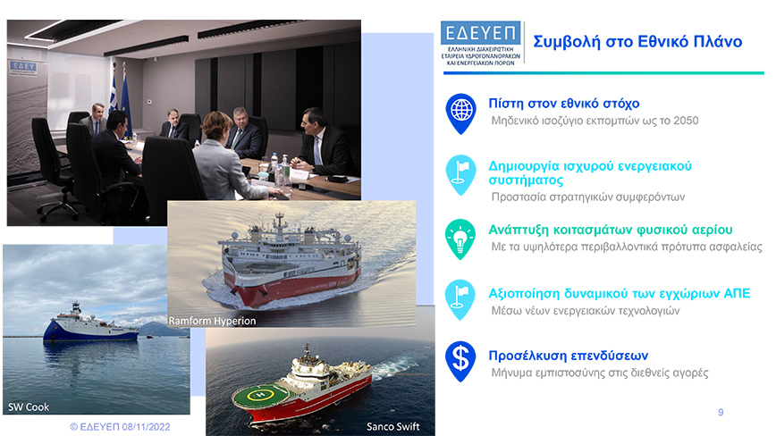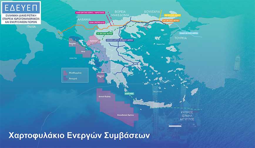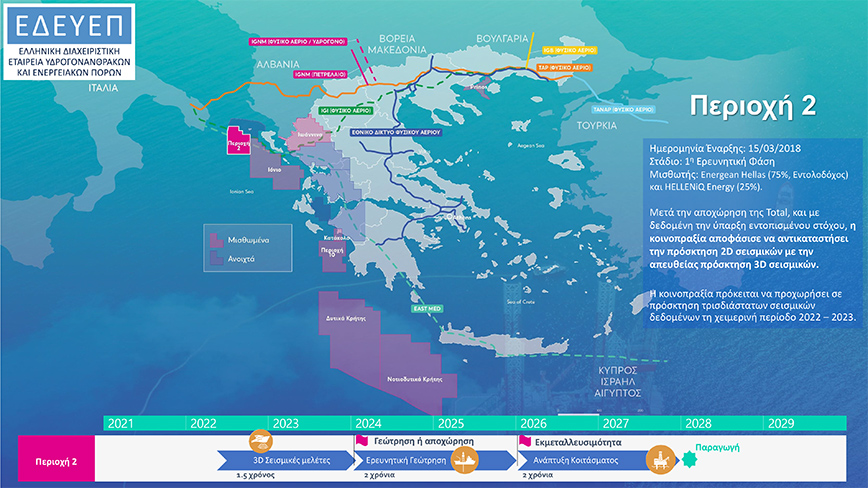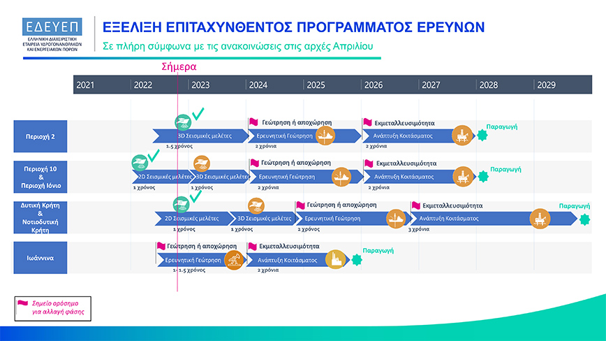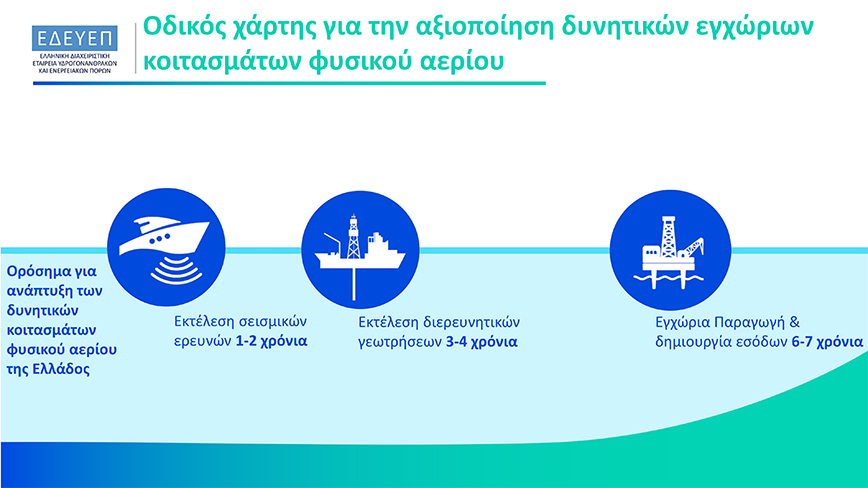 «Τον Απρίλιο, ο Πρωθυπουργός ανακοίνωσε την επιτάχυνση του χρονοδιαγράμματος για τη διερεύνηση των δυνητικών αποθεμάτων φυσικού αερίου της χώρας και την επέκταση του σκοπού της ΕΔΕΥΕΠ, η οποία έχει πλέον υπό την επίβλεψη της έργα εξερεύνησης και παραγωγής υδρογονανθράκων, διαχείρισης και δέσμευσης αερίων του θερμοκηπίου, γεωλογικής αποθήκευσης αερίων, ανάπτυξης υπεράκτιων αιολικών πάρκων και διεθνών αγωγών», αναφέρει η ΕΔΕΥΕΠ.