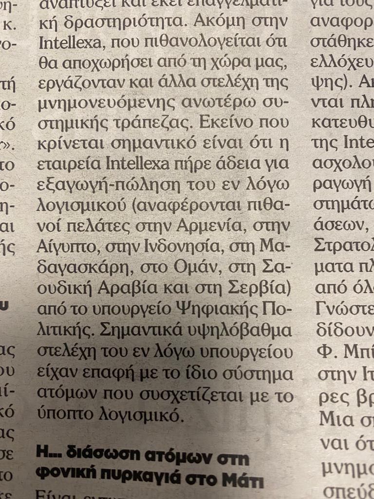 «Το Υπουργείο Ψηφιακής Διακυβέρνησης διαψεύδει κατηγορηματικά την αναφορά σε δημοσίευμα εφημερίδας σχετικά με χορήγηση άδειας σε εταιρεία για εξαγωγή – πώληση λογισμικού από το Υπουργείο. Το Υπουργείο Ψηφιακής Διακυβέρνησης δεν διαθέτει, σε καμία περίπτωση, αρμοδιότητα χορήγησης άδειας εξαγωγής – πώλησης οποιουδήποτε προϊόντος, συμπεριλαμβανομένου του φερόμενου λογισμικού, ούτε και έχει κάποια σχετική γνώση για τη συγκεκριμένη ή άλλη παρόμοια περίπτωση» τονίζουν πηγές του υπουργείου.