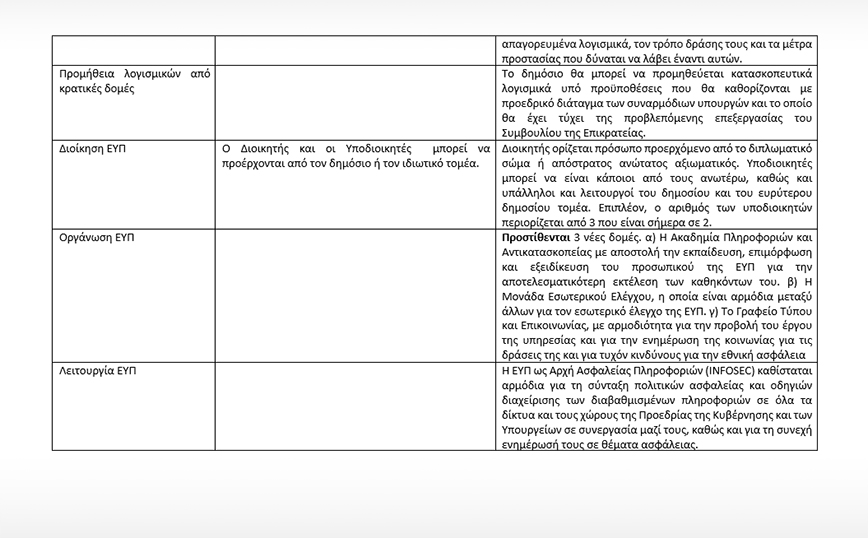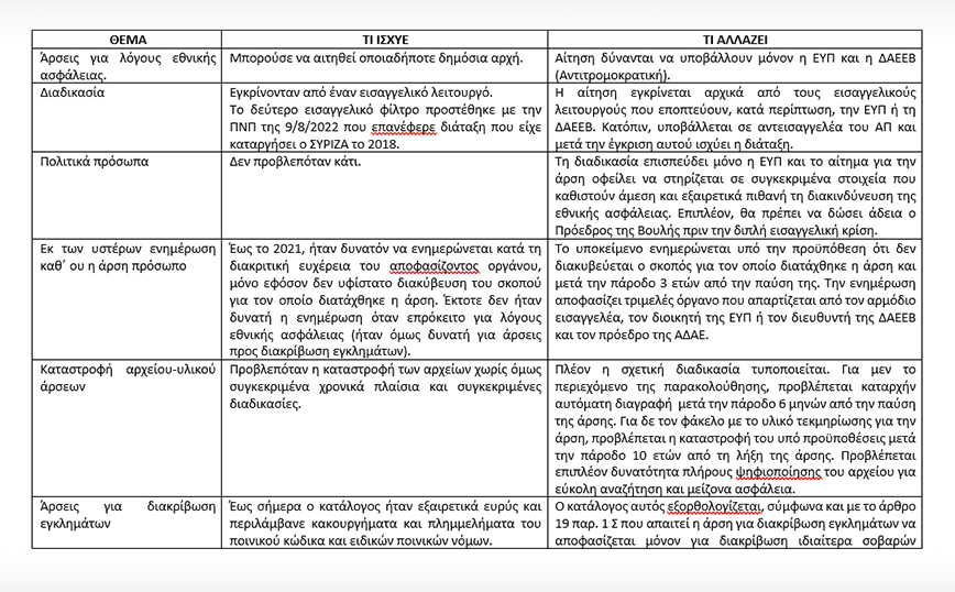 Το νομοσχέδιο περιλαμβάνει αλλαγές στα θέματα του απορρήτου, την λειτουργία της ΕΥΠ, αλλά και τι θα ισχύει με τις παρακολουθήσεις.