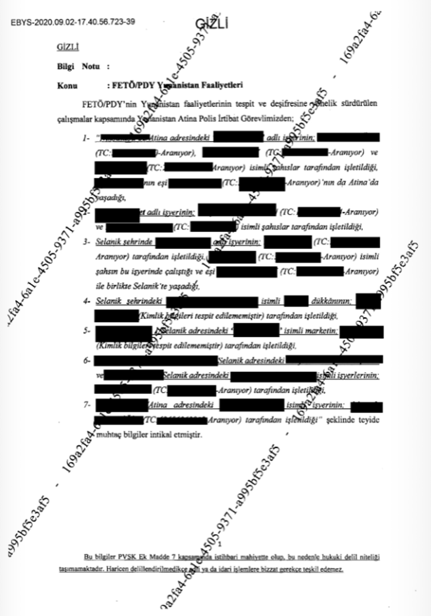 Ειδικότερα, το απόρρητο έγγραφο που έστειλε η Γενική Διεύθυνση Ασφαλείας της Τουρκίας (Emniyet) στις 2 Σεπτεμβρίου του 2020 με παραλήπτες τουλάχιστον δώδεκα τουρκικά αστυνομικά τμήματα περιέχει πληροφορίες και στοιχεία που συγκέντρωσε ο Τούρκος αστυνομικός, από παρακολουθήσεις σε Αθήνα και Θεσσαλονίκη.
