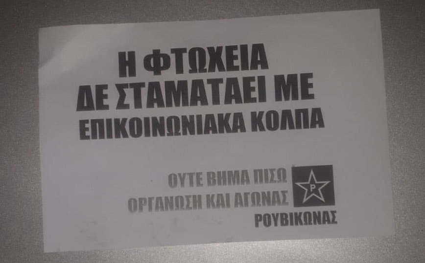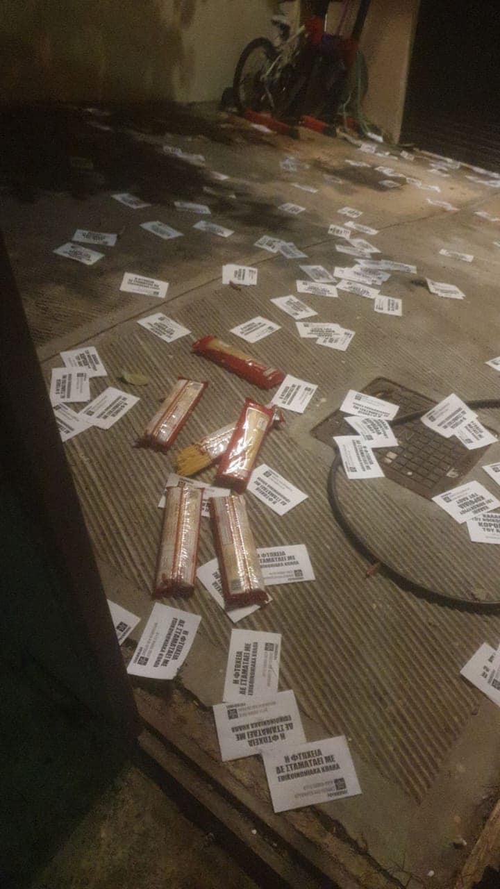 «Η φτώχεια δεν σταματάει με επικοινωνιακά κόλπα», έγραφαν τα τρικάκια που πέταξαν τα μέλη του Ρουβίκωνα ενώ μαζί με τα φέιγ βολάν υπάρχαν και πακέτα από μακαρόνια