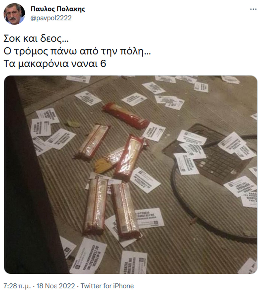 Την αντίδραση της Νέας Δημοκρατίας προκάλεσε ένα tweet του Παύλου Πολάκη για την επίθεση στο σπίτι του υπουργού Ανάπτυξης και Επενδύσεων, Άδωνι Γεωργιάδη. «Σοκ και δέος… Ο τρόμος πάνω από την πόλη… Τα μακαρόνια ναναι 6», έγραψε ο βουλευτής του ΣΥΡΙΖΑ και ανάρτησε μια σχετική φωτογραφία.