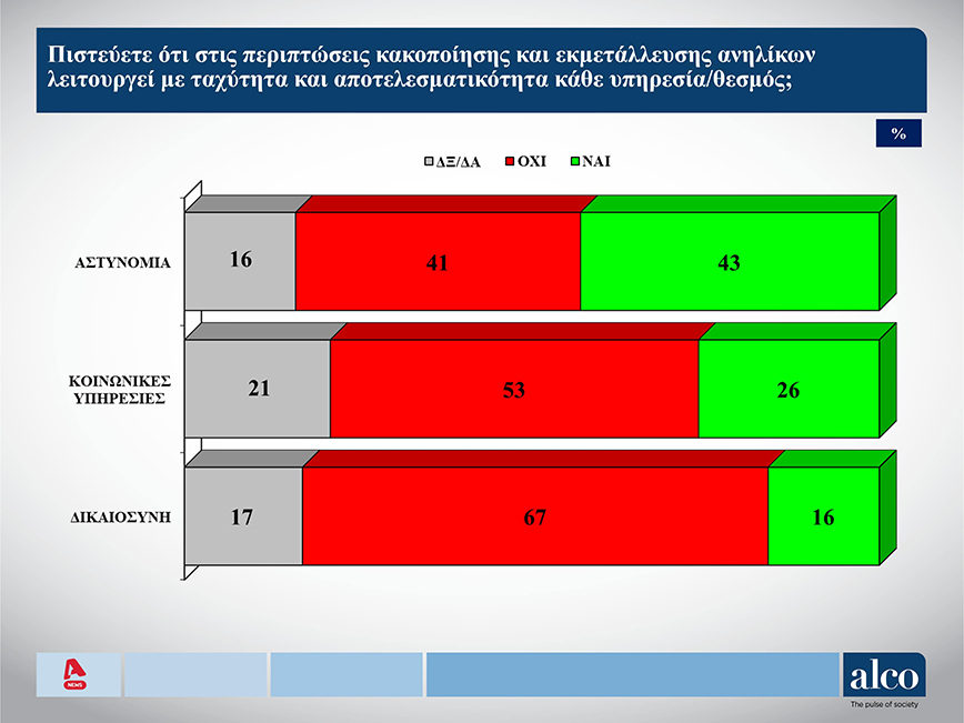 Απογοητευτική η εικόνα των πολιτών για την αντίδραση αστυνομίας, κοινωνικών υπηρεσιών και Δικαιοσύνης σε περιπτώσεις κακοποίησης ή εκμετάλλευσης παιδιών. Η δημοσκόπηση πραγματοποιήθηκε πριν καλά-καλά ξεσπάσει το σκάνδαλο των καταγγελιών για την Κιβωτό του Κόσμου. Ηη πλειοψηφία των πολιτών θεωρεί ότι οι κοινωνικές υπηρεσίες και πολύ περισσότερο η Δικαιοσύνη (σε ποσοστό μεγαλύτερο του 60%) δεν λειτουργούν με ταχύτητα και αποτελεσματικότητα σε περίπτωση κακοποίησης παιδιών. Μικρότερη η απογοήτευση των πολιτών σε σχέση με την ανταπόκριση της αστυνομίας σε αυτές τις περιπτώσεις.