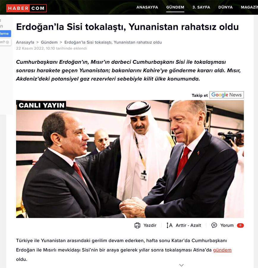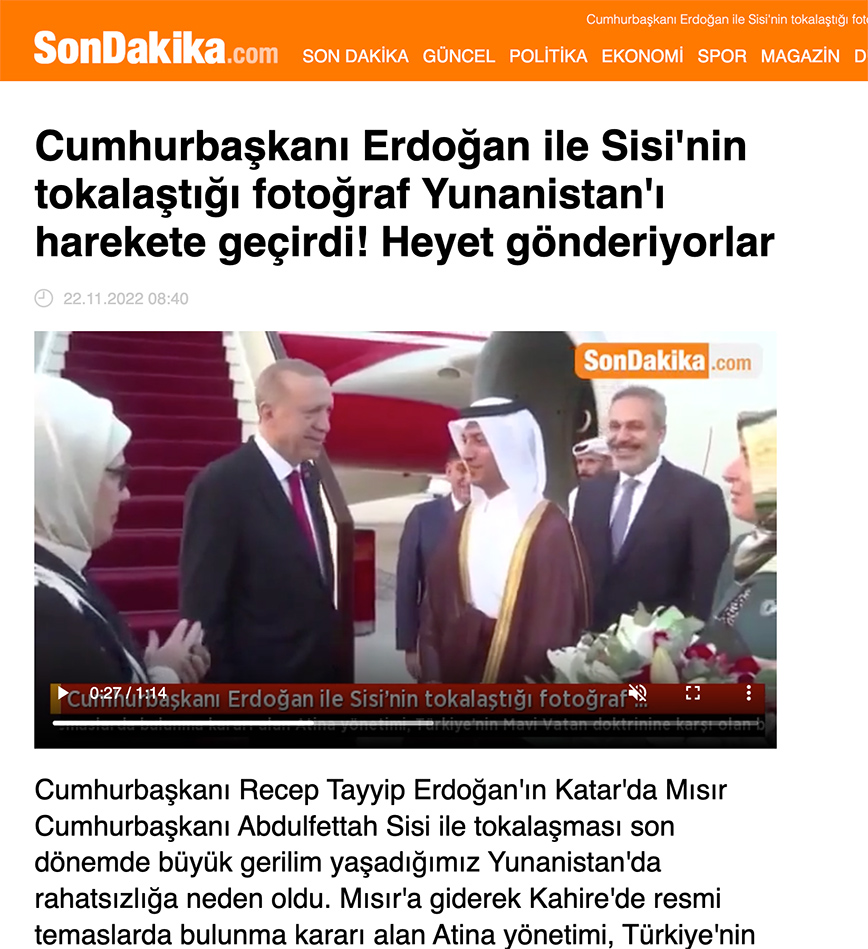 «Η φωτογραφία με τον Πρόεδρο Ερντογάν και τον Σίσι να δίνουν τα χέρια ταρακούνησε την Ελλάδα, που στέλνει αντιπροσωπεία στην Αίγυπτο» σχολιάζει από την πλευρά του το δίκτυο Son Dakika, ενώ η ιστοσελίδα haber.com αναφέρει ότι: