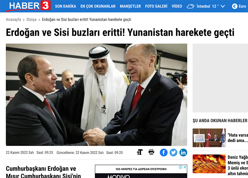 Στη γειτονική χώρα η σύντομη χειραψία Αλ Σίσι και Ερντογάν ερμηνεύεται ως «λιώσιμο των πάγων» μεταξύ των δύο χωρών – θυμίζουμε ότι ο Τούρκος πρόεδρος είχε χαρακτηρίσει τον Αιγύπτιο ομόλογό του «δολοφόνο» και «δικτάτορα». Σύμφωνα με το δίκτυο Haber3, «η χειραψία του προέδρου Ερντογάν και του Αιγύπτιου προέδρου Σίσι προκάλεσε πανικό στην Ελλάδα» ενώ ο τίτλος του κειμένου είναι: «Ερντογάν και Σίσι έλιωσαν τον πάγο – Η Ελλάδα ανέλαβε δράση».