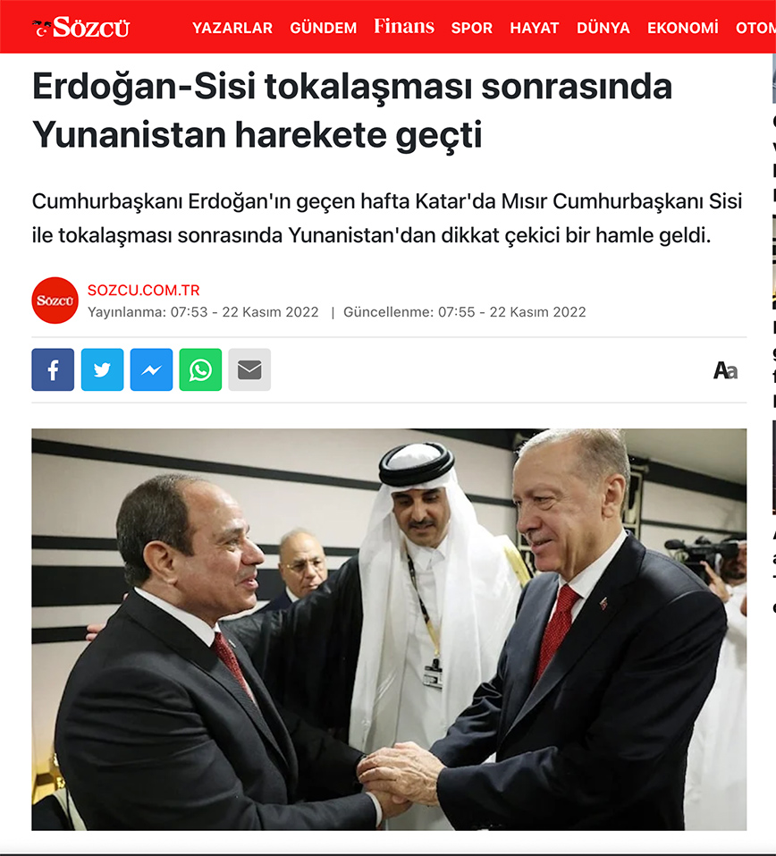 Στο ίδιο μήκος κύματος η εφημερίδα Sozcu έχει κείμενο με τίτλο: «Η Ελλάδα ανέλαβε δράση μετά τη χειραψία Ερντογάν-Σίσι» κάνοντας λόγο για αντίδραση της χώρας μας εξαιτίας της συνάντησης του προέδρου Ερντογάν με τον κ. Αλ Σίσι στη Ντόχα του Κατάρ.