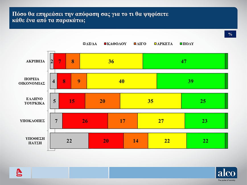 Η ακρίβεια είναι ο παράγοντας που θα διαμορφώσει την ψήφο των πολιτών, σύμφωνα με δημοσκόπηση της Alco για τον Alpha. Ειδικότερα, το 47% των ερωτηθέντων στην έρευνα που διεξήχθη από 14 μέχρι 18 Νοεμβρίου σε δείγμα 1.000 ανθρώπων, απάντησε ότι η ακρίβεια θα επηρεάσει σε πολύ μεγάλο βαθμό την ψήφο του. Σημαντικοί παράγοντες είναι επίσης η πορεία της οικονομίας, τα ελληνοτουρκικά, οι υποκλοπές, και η υπόθεση Πάτση.