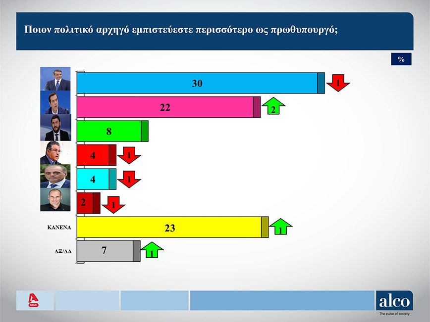 Τέλος, το 30% των ερωτηθέντων εμπιστεύεται ως πρωθυπουργό τον Κυριάκο Μητσοτάκη, το 22% τον Αλέξη Τσίπρα, το 8% τον Νίκο Ανδρουλάκη, το 4% «ψηφίζει» Δημήτρη Κουτσούμπα και Κυριάκο Βελόπουλο και το 2% Γιάνη Βαρουφάκη.