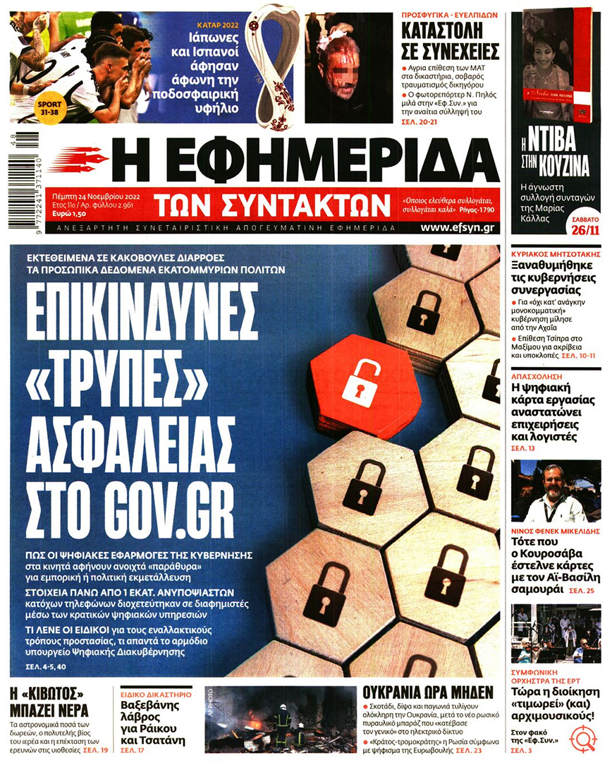 Το πρωτοσέλιδο της εφημερίδας αναφέρει: «Εκτεθειμένα σε κακόβουλες διαρροές τα προσωπικά δεδομένα εκατομμυρίων πολιτών, πώς οι ψηφιακές εφαρμογές της κυβέρνησης στα κινητά αφήνουν ανοιχτά “παράθυρα” για εμπορική ή πολιτική εκμετάλλευση. Στοιχεία πάνω από 1 εκατ. ανυποψίαστων κατόχων τηλεφώνων διοχετεύτηκαν σε διαφημιστές μέσω των κρατικών ψηφιακών υπηρεσιών. Τι λένε οι ειδικοί για τους εναλλακτικούς τρόπους προστασίας, τι απαντά το αρμόδιο υπουργείο Ψηφιακής Διακυβέρνησης».