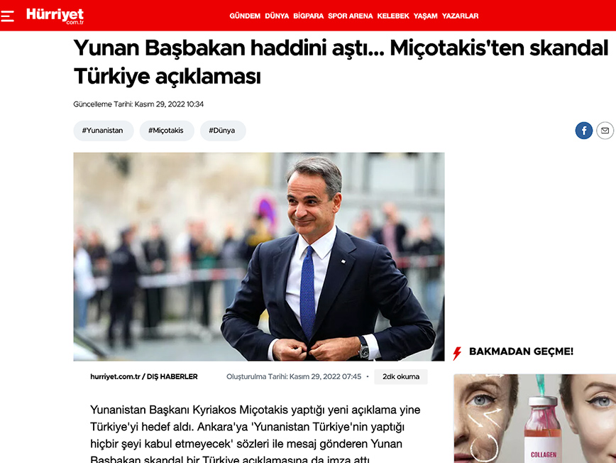 Υπό τον τίτλο «Ο Έλληνας πρωθυπουργός ξεπέρασε τα όρια. Σκανδαλώδεις δηλώσεις από Μητσοτάκη για την Τουρκία», η γνωστή φιλοκυβερνητική εφημερίδα Hurriyet, επιτίθεται κατά του προέδρου της ελληνικής κυβέρνησης με αφορμή τις δηλώσεις του στο London School of Economics της οποίες έκρινε… άκρως επιθετικές.