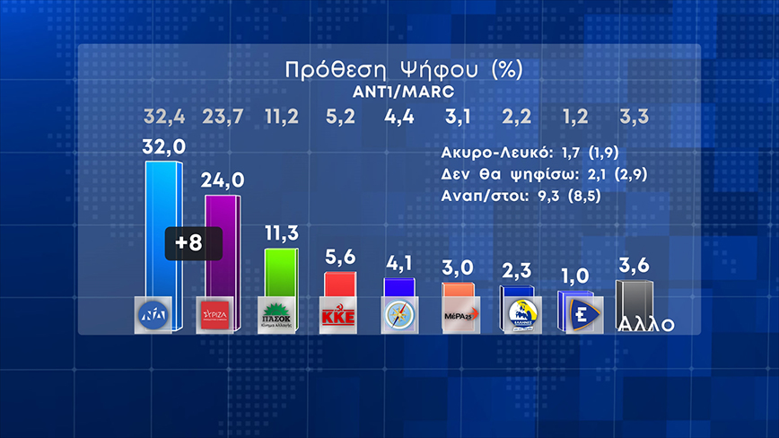 Σαφές προβάδισμα της ΝΔ έναντι του ΣΥΡΙΖΑ καταγράφουν δύο νέα γκάλοπ είδαν το φως της δημοσιότητας τις τελευταίες 48 ώρες. Στη δημοσκόπηση της Marc για τον ΑΝΤ1 το κυβερνών κόμμα (32%) προηγείται 8 μονάδες της αξιωματικής αντιπολίτευσης (24%), ενώ στην έρευνα της Prorata για την εφημερίδα των Συντακτών στην πρόθεση ψήφου η ΝΔ συγκεντρώνει το 30% και ο ΣΥΡΙΖΑ – ΠΣ ακολουθεί με 25% με την απόσταση να καταγράφεται στις 5 μονάδες. Τρίτο κόμμα αναδεικνύεται το ΠΑΣΟΚ – ΚΙΝΑΛ με 10,5% ενώ ακολουθεί το ΚΚΕ με 4,5%, η Ελληνική Λύση με 4% και ο ΜεΡΑ25 με 2,5%.