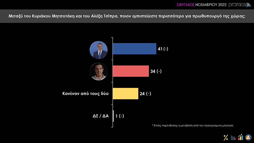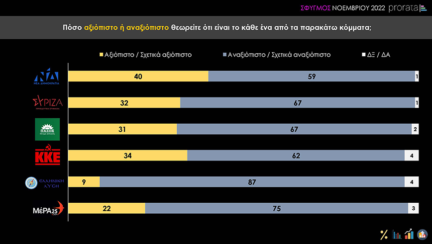 Η Νέα Δημοκρατία παραμένει πιο αξιόπιστο πολιτικό κόμμα στη δημοσκόπηση της Prorata, όπως αναφέρει το 40% των ερωτηθέντων. Ακολουθεί το ΚΚΕ με 34% ενώ 32% συγκεντρώνει ο ΣΥΡΙΖΑ. Με μόλις μια μονάδα διαφορά ακολουθεί το ΠΑΣΟΚ – ΚΙΝΑΛ, που συγκεντρώνει 31%. Το ΜέΡΑ25 παρουσιάζει ποσοστό 22% ενώ τελευταίο κόμμα στη λίστα είναι η Ελληνική Λύση, με 9%. Σύμφωνα δε με τον δείκτη ικανότητας διακυβέρνησης, ένας στους δύο θεωρεί ότι η ΝΔ είναι «ικανό» ή «σχετικά ικανό» κόμμα για να κυβερνήσει ενώ με ποσοστό 36% ακολουθεί ο ΣΥΡΙΖΑ.