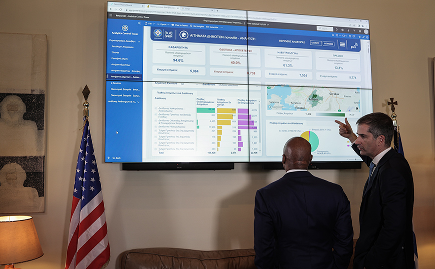 Η συνάντηση ξεκίνησε στο δημαρχιακό μέγαρο με την επίδειξη του ψηφιακού πίνακα που αφορά τη διεκπεραίωση των αιτημάτων των δημοτών της πρωτεύουσας.
