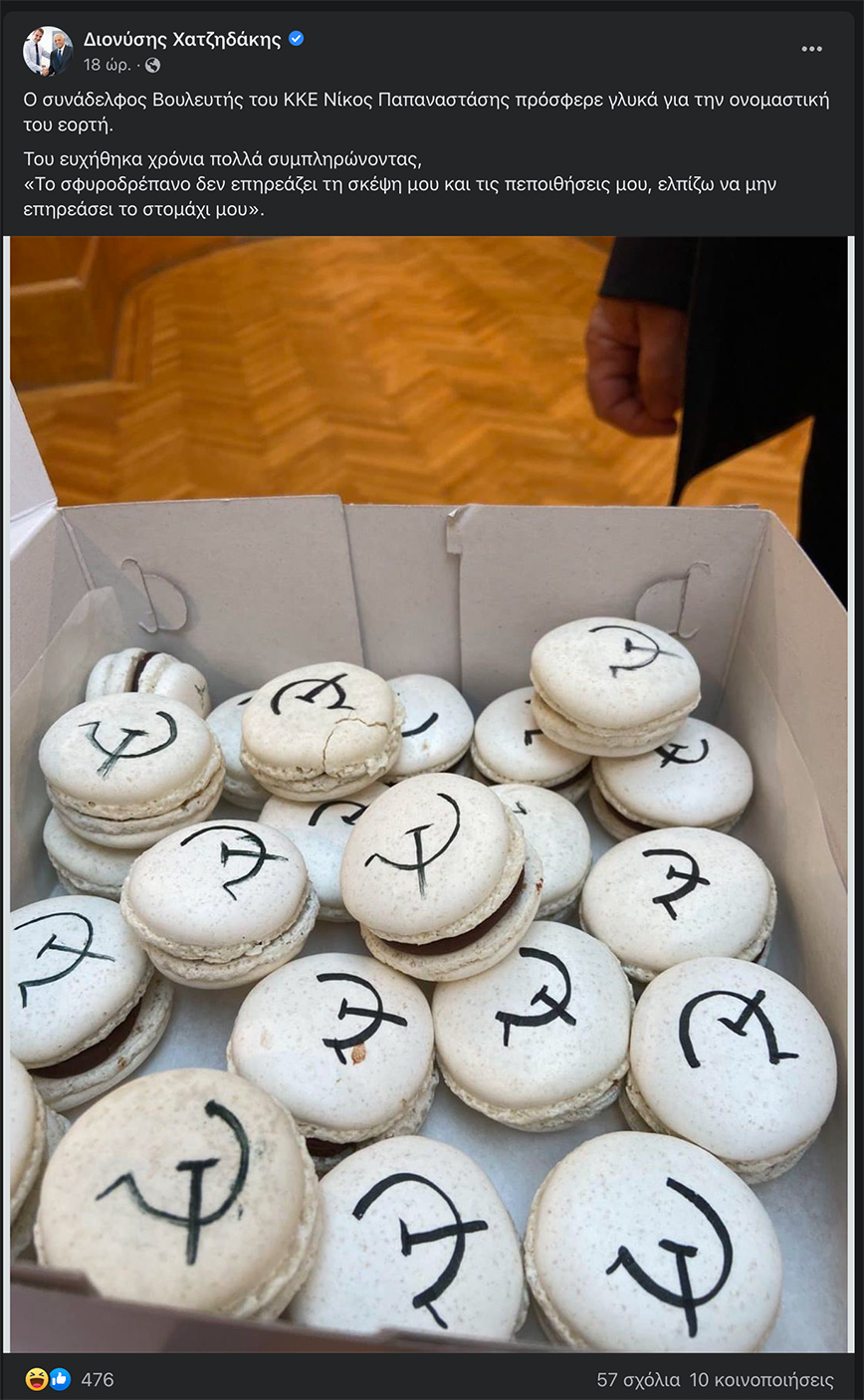 Προχθές ο βουλευτής Αιτωλοακαρνανίας του Κομμουνιστικού Κόμματος Ελλάδος Νίκος Παπαναστάσης είχε την ονομαστική του εορτή και όταν πήγε στη Βουλή, θέλησε να κεράσει τους συναδέλφους του. Έτσι λοιπόν πήγε με ένα μεγάλο κουτί γεμάτο γλυκά. Είχε επιλέξει νοστιμότατα λευκά μακαρόν, τα οποία όμως επάνω είχαν ζωγραφισμένο ένα σφυροδρέπανο, σύμβολο του ΚΚΕ και του κομμουνισμού γενικότερα.