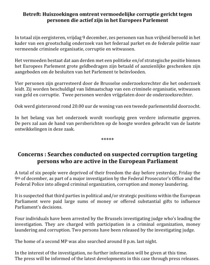 Τέσσερα άτομα συνελήφθησαν από τον ανακριτή των Βρυξελλών που ηγείται της έρευνας. Κατηγορούνται για συμμετοχή σε εγκληματική οργάνωση, ξέπλυμα χρήματος και διαφθορά. Δύο αφέθησαν ελεύθξερα από τον ανακριτή.