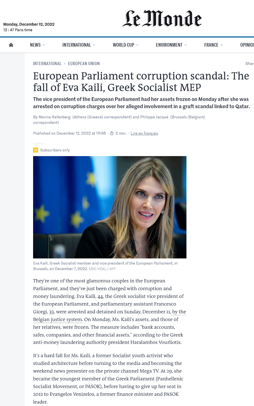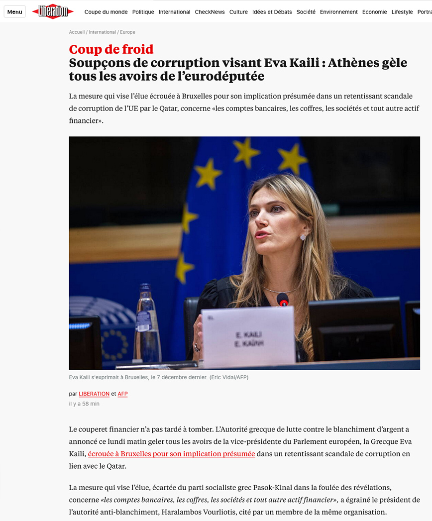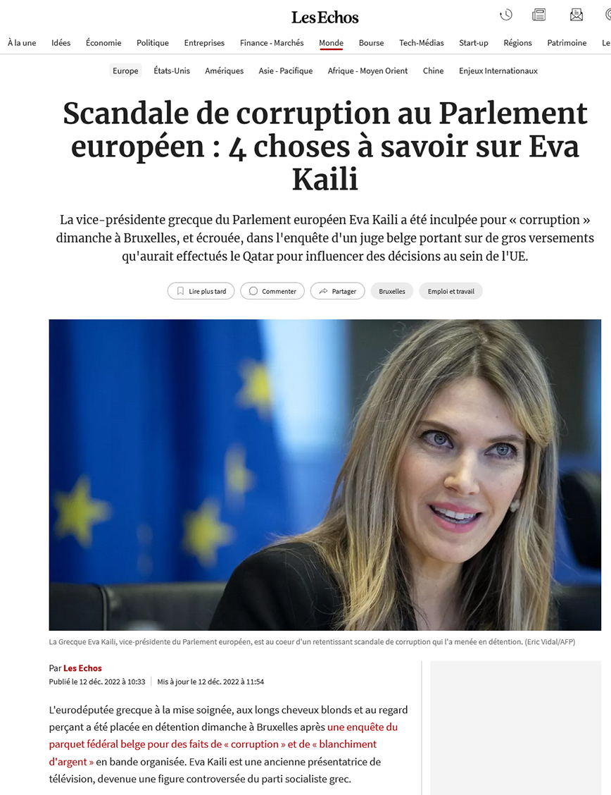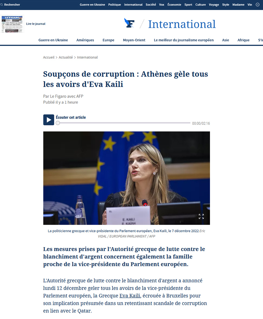 «Σκάνδαλο διαφθοράς στο Ευρωπαϊκό Κοινοβούλιο: 4 άτομα τα οποία κατηγορούνται φυλακίστηκαν, μεταξύ των οποίων και η αντιπρόεδρος Εύα Καϊλή» είναι ο τίτλος σχετικού δημοσιεύματος στην εφημερίδα Le Figaro όπου αφού εξιστορούνται τα όσα συνέβησαν την Παρασκευή στις Βρυξέλλες.