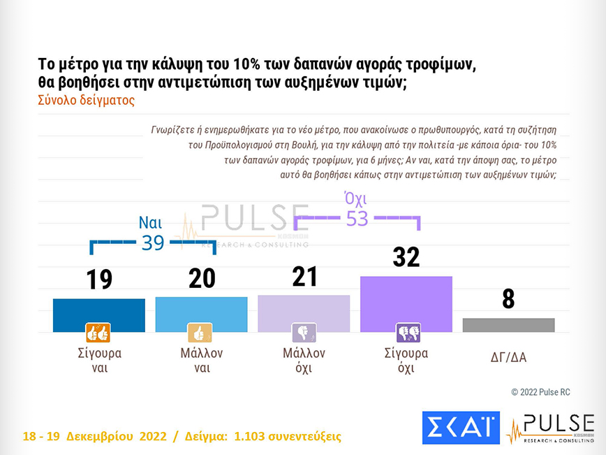 Για το αν θα βοηθήσει το μέτρο του Market Pass, το 39% απάντησε «ναι», το 53% «όχι» και το 8% ΔΓ/ΔΑ.