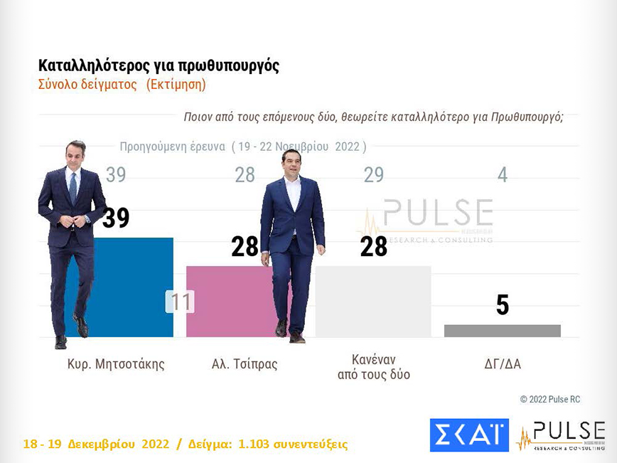 Καταλληλότερος για πρωθυπουργός με 39% εμφανίζεται ο Κυριάκος Μητσοτάκης, ο Αλέξης Τσίπρας ακολουθεί με 28%, όπως και ο κανένας από τους δύο με το ίδιο ποσοστό. 5% απάντησαν ΔΓ/ΔΑ.